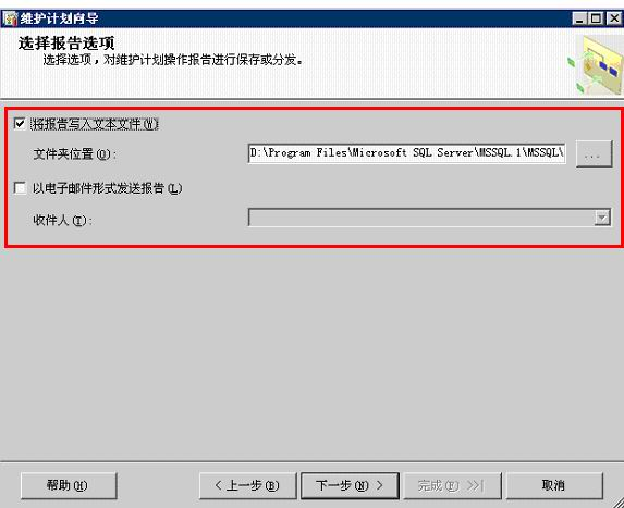 10、彈出【選擇報告選項】對話框,在該對話框里可以選擇如何管理維護(hù)計劃報告:可以將報告寫入文件中,或通過電子郵件發(fā)送數(shù)據(jù)庫管理員。設(shè)置完畢后單擊【下一步】按鈕。