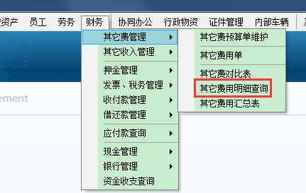 3、工程項(xiàng)目管理軟件還提供分?jǐn)傎M(fèi)用的查詢,在菜單財(cái)務(wù)里點(diǎn)擊其他費(fèi)用明細(xì)查詢,出現(xiàn)其他費(fèi)明細(xì)查詢界面