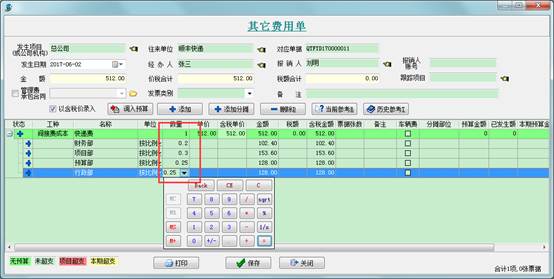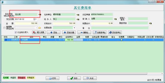 發(fā)生的項(xiàng)目我們選擇總公司,費(fèi)用名稱為快遞費(fèi)(可以事先在費(fèi)用科目維護(hù)里設(shè)置好)。