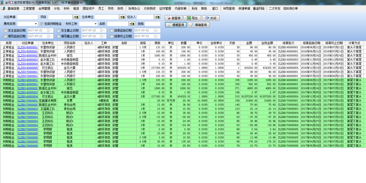在租賃管理方便,經常租一些周轉材料,跟租賃公司都是長期合作,結算方式都是采用季度結算或者年度結算,之前采用紙質或者excel統(tǒng)計,統(tǒng)計并不準確,到季度或者年度結算時往往統(tǒng)計不準確,都是按照供應商提供數(shù)據進行結算,具體租賃費并沒有參考依據。采用金石項目管理軟件后,可以實時查看租賃情況,統(tǒng)計租賃庫存,并且最后結算時選好結算批次可以自動計算結算租金。在租賃過程中并可以實時查看預期租金,評估預期成本。采用采用金石項目管理軟件后租金統(tǒng)計準確,對后期結算產生了很大的幫助。