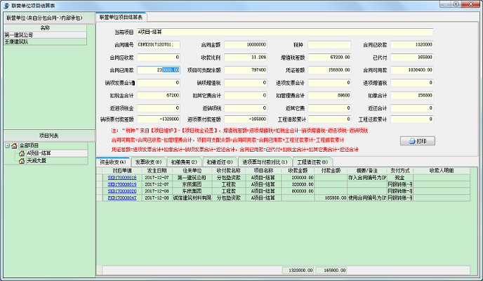 一、 左上角的【聯(lián)營單位】列表來自【分包合同】類型為“內(nèi)部承包”的乙方單位。 左下角的【項目列表】來自聯(lián)營單位與我單位簽定“內(nèi)部承包”的【分包合同】中的項目名稱。二、 合同編號:對應當前項目下的承包合同編號; 合同金額:對應當前項目下的承包合同金額; 稅種:對應【項目維護】->【項目稅金設置】->【增值稅稅率】 合同已收款:對應當前項目下的承包合同收取的工程款數(shù)額; 合同應收款:對應當前項目下的承包合同應收的工程款數(shù)額; 收款比例:合同已收款/合同金額; 增值稅差額:進項增值稅+扣稅金合計-銷項增值稅-返進項稅-返銷項稅; 已代付:代支付給材料供應商、分包商或其他往來單位的款項金額; 合同已用款:已代付金額+扣稅金合計+扣其他費合計-返還合計; 合同可用款:合同已收款-扣管理費合計; 項目可支配余額:合同可用款-合同已用款+工程還款累計-工程借款累計; 憑證差額:進項發(fā)票合計+扣繳合計-銷項發(fā)票合計-返還合計; 銷項發(fā)票合計:對應當前項目下開出發(fā)票的合計金額; 銷項增值稅:對應當前項目下開出發(fā)票的增值稅稅額; 進項發(fā)票合計:對應當前項目下收入發(fā)票的合計金額; 進項增值稅:對應當前項目下收入發(fā)票的增值稅稅額; 扣稅金合計:對應當前項目聯(lián)營單位的【分包合同】->【扣繳費用】下稅金合計; 扣管理費合計:對應當前項目聯(lián)營單位的【分包合同】->【扣繳費用】下管理費合計; 扣其它費合計:對應當前項目聯(lián)營單位的【分包合同】->【扣繳費用】下其它費合計; 扣繳合計:扣稅金合計+扣管理費合計+扣其其它合計; 返進項稅金:對應當前項目聯(lián)營單位的【分包合同】->【扣繳返回】下的進項稅合計; 返銷項稅金:對應當前項目聯(lián)營單位的【分包合同】->【扣繳返回】下的銷項稅合計; 返其它費:對應當前項目聯(lián)營單位的【分包合同】->【扣繳返回】下的其它費合計; 返還合計:返進項稅金+返銷項稅金+返其它費; 銷項票收款差額:當前項目累計開出發(fā)票與收款之差; 進項票付款差額:當前項目累計收進發(fā)票與付款之差; 工程借款累計:對應當前項目下該聯(lián)營單位的工程借款; 工程還款累計:對應當前項目下該聯(lián)營單位的工程還款;