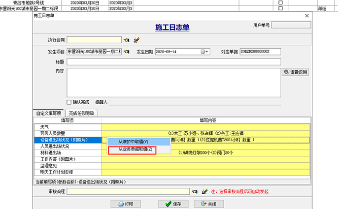 項目部人員選擇項目之后,右鍵點擊下圖中黃色區(qū)域,選擇彈出框中的“從業(yè)務(wù)單據(jù)取值”,系統(tǒng)會根據(jù)當(dāng)前發(fā)生日期所填報的【勞務(wù)考勤單】、【材料驗收單】、【機(jī)械日報單】自動生成當(dāng)天的施工日志。