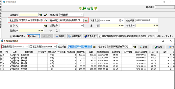 【機(jī)械結(jié)算單】需先設(shè)置發(fā)生的項目和往來單位,根據(jù)下圖所示:點擊圖中“調(diào)入”按鍵,選擇起始日期和截止日期(截止日期默認(rèn)是錄單日期),選中下方涉及的租賃明細(xì)生成一張完整的【機(jī)械結(jié)算單】。