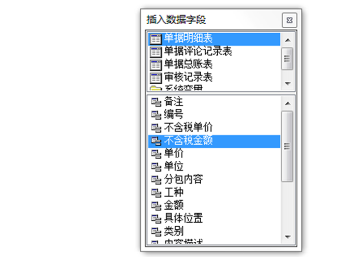 4. 系統(tǒng)和Excel最大的區(qū)別就是,我們可以直接從系統(tǒng)中調(diào)集數(shù)據(jù)。只要在懸浮窗【插入數(shù)據(jù)字段】中選擇對于的字段即可。