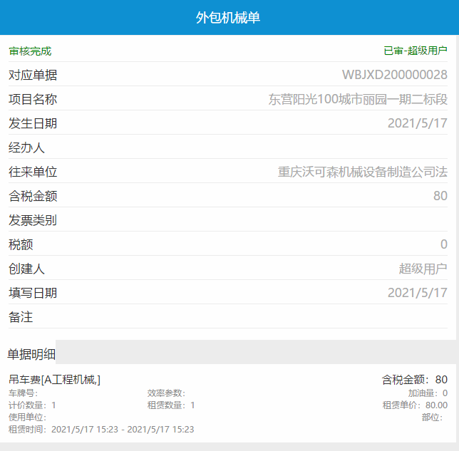 適用單據(jù):外包人工單、材料采購(gòu)單、運(yùn)輸車輛單、外包機(jī)械單、租賃結(jié)算單、其它費(fèi)用單、設(shè)備采購(gòu)單、設(shè)備維修單、勞務(wù)考勤單、勞務(wù)加班單、勞務(wù)計(jì)件單、勞務(wù)預(yù)支單、勞務(wù)工資單。