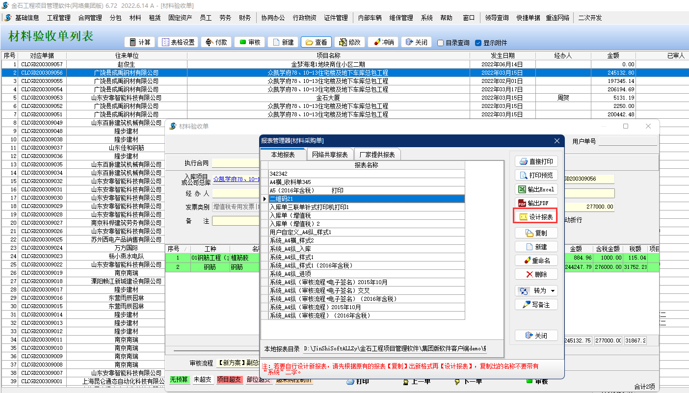 1、打開(kāi)材料驗(yàn)收單列表,找到單據(jù)點(diǎn)擊查看后點(diǎn)擊打印按鈕。找到常用報(bào)表點(diǎn)擊設(shè)計(jì)報(bào)表。