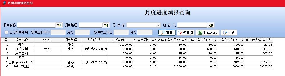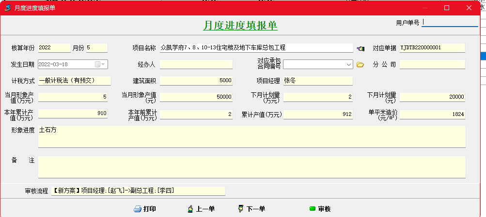 月度進度填報單可以實現(xiàn)按月上報形象產(chǎn)值進度并自動統(tǒng)計當(dāng)年度產(chǎn)值,總產(chǎn)值以及單平米造價??梢钥梢愿鶕?jù)上報的產(chǎn)值計算待收款以及利潤。