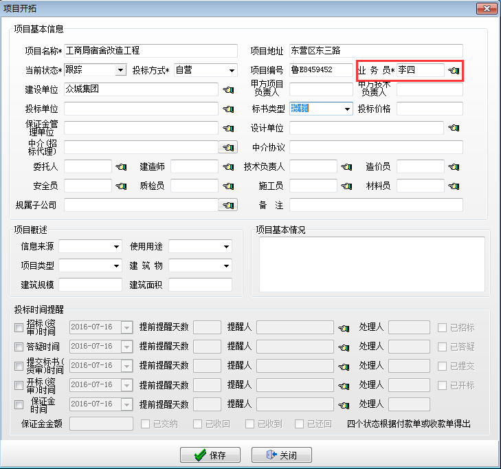 在施工項(xiàng)目管理軟件項(xiàng)目開拓建立開拓項(xiàng)目,【項(xiàng)目開拓】中業(yè)務(wù)員必須要與【銷售任務(wù)】中業(yè)務(wù)負(fù)責(zé)人一致。如下圖: