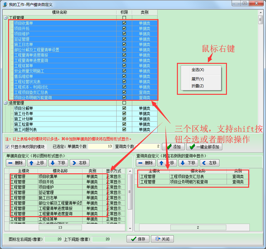 (2)上方選擇區(qū)域、下方的單據類自定義和查詢類自定義區(qū)域中,都支持shift鍵 全選 操作。此外有一鍵添加所有功能的按鈕在。