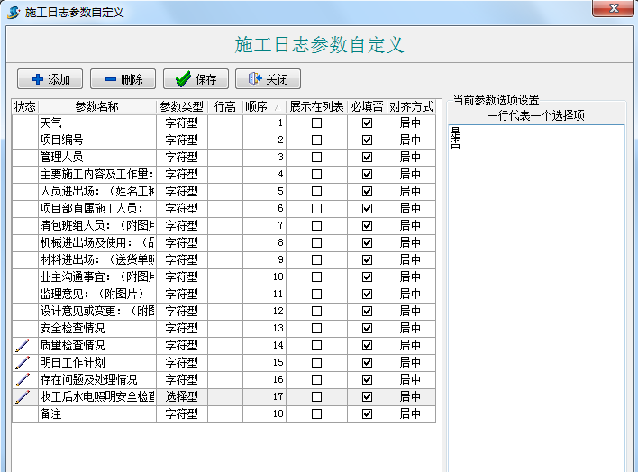 ①點“添加”按鍵增加豎列; ②在“參數(shù)名稱”列輸入需要的內(nèi)容; ③“參數(shù)類型”列選擇類型,其中“字符型”可輸入文字和數(shù)值、 “選擇型”可以如下圖中顯示一行代表一個選擇項,只可選擇不能輸入 、“數(shù)值型”只能輸入數(shù)值,不能輸入文字內(nèi)容 、 “布爾型”則是勾選選擇型; ④“順序”列調整自定義項的先后排序 。