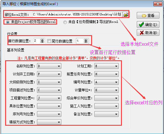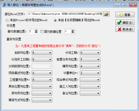上圖為來自project軟件導出的excel格式。在進度管理中導入時選擇好本地excel文件,設置好首行尾行數(shù)據(jù)位置,選擇好對應excel表中各列位置,即可選擇確定導入,如下圖: