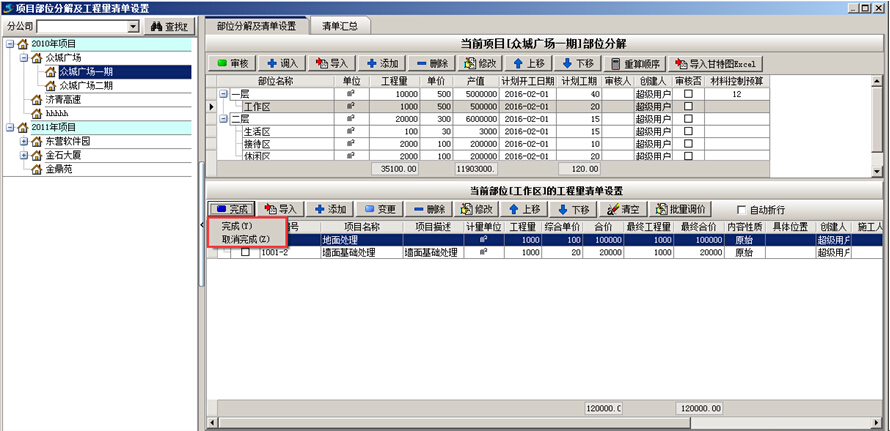 (2)由于某種原因工程不再繼續(xù)進(jìn)行,但是完成的工作量小于設(shè)置的工程量,此時(shí)需要在【部位分解工程量清單設(shè)置】中手動設(shè)置清單為“完成”狀態(tài)。如圖: