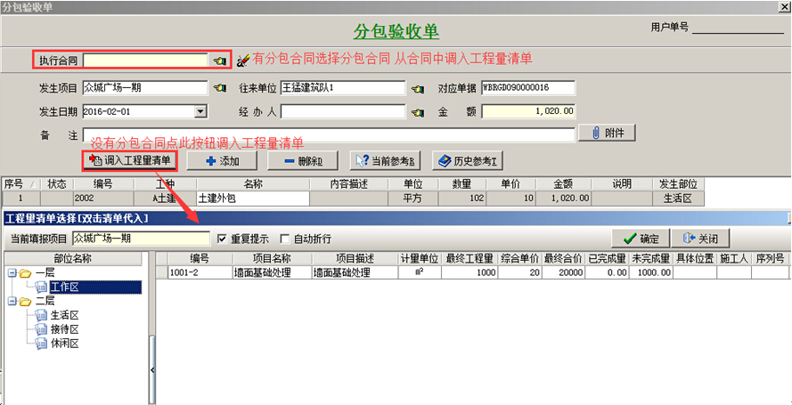 (2)分包驗(yàn)收單中,如果簽訂了分包合同點(diǎn)[執(zhí)行合同],從合同內(nèi)容中選擇清單,否則點(diǎn)擊[調(diào)入工程量清單],把工程量清單調(diào)入分包驗(yàn)收單中。如圖: