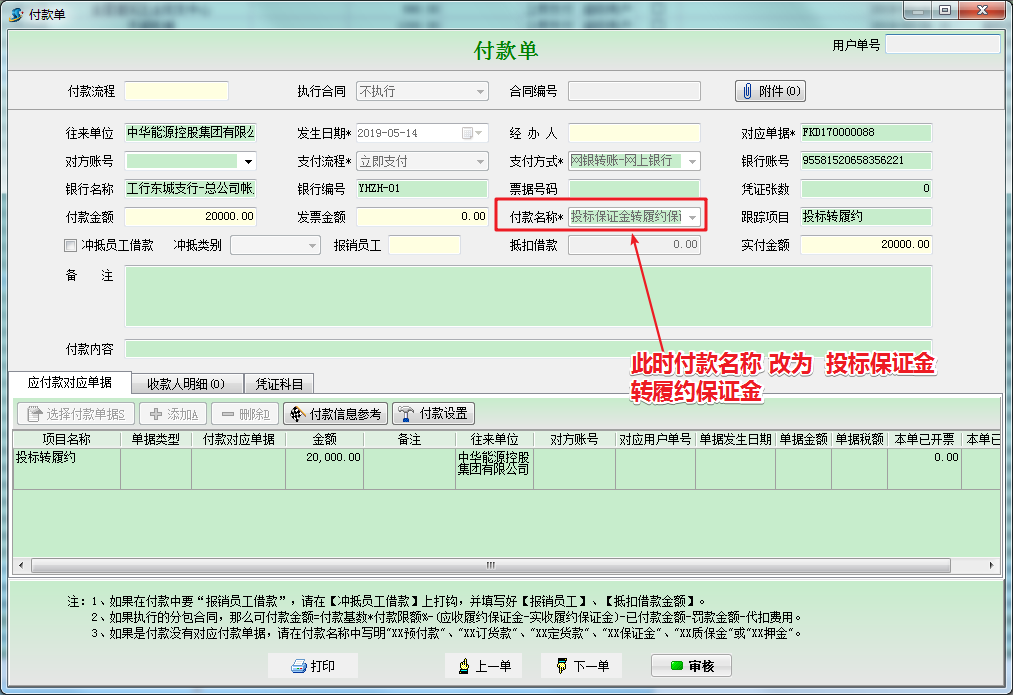 選擇結(jié)轉(zhuǎn)后,我們再去查看原投標(biāo)保證金的付款單時(shí),發(fā)現(xiàn)付款名稱變?yōu)椋和稑?biāo)保證金轉(zhuǎn)履約保證金,如下圖所示,