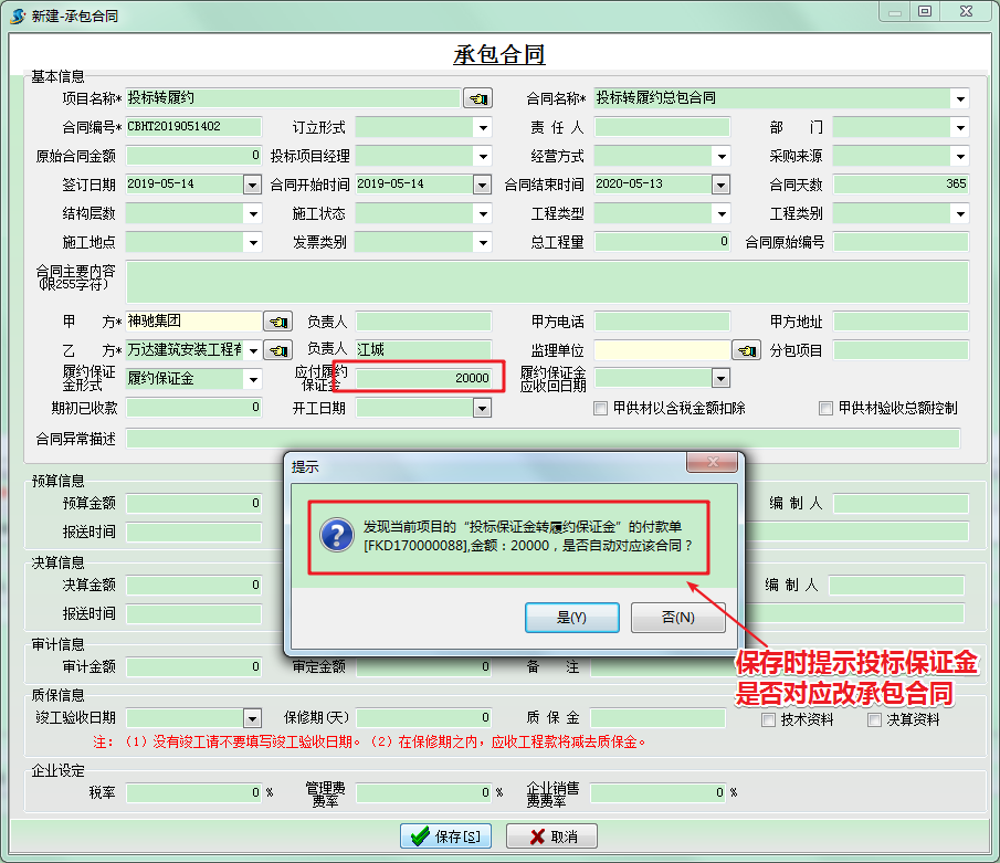 3、承包合同建立時(shí),會(huì)發(fā)現(xiàn)應(yīng)付履約保證金金額為投標(biāo)保證金的金額,而且在保存時(shí)會(huì)有是否對應(yīng)合同的提示,如下圖所示,