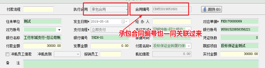 選擇對應(yīng)合同后,我們再去查看原投標(biāo)保證金的付款單時(shí),會(huì)發(fā)現(xiàn),該付款單已經(jīng)與新建的承包合同關(guān)聯(lián)起來。