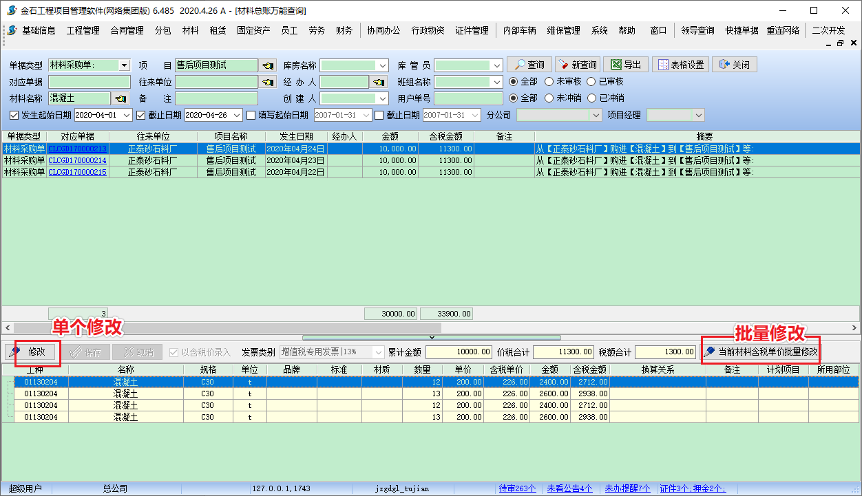 選擇其中一個單據(jù),點擊下方要修改的材料明細(xì),點擊批量修改。如下圖