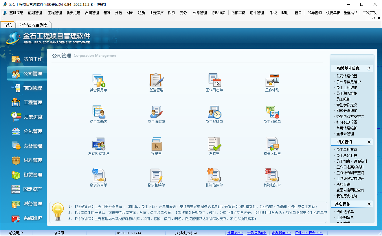 增加了公司管理,前期管理和勞務(wù)管理的導(dǎo)航模塊。公司管理模塊包括行政部門主要的管理內(nèi)容,如員工維護、員工考勤單、員工請假單、員工加班單、員工罰款單等員工管理的內(nèi)容;如物資入庫單、物資領(lǐng)用單、物資借用單、物資歸還單等行政物資的內(nèi)容;還增加了投票單和考核單的內(nèi)容。前期管理模塊主要包括項目收集單、項目開拓、投標(biāo)資料庫、報價資料庫和投標(biāo)人員業(yè)績查詢等內(nèi)容。勞務(wù)管理模塊主要是把原菜單的內(nèi)容添加進來,讓導(dǎo)航模塊內(nèi)容更充實。
