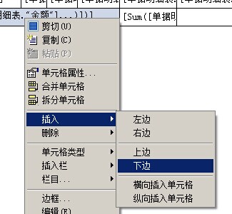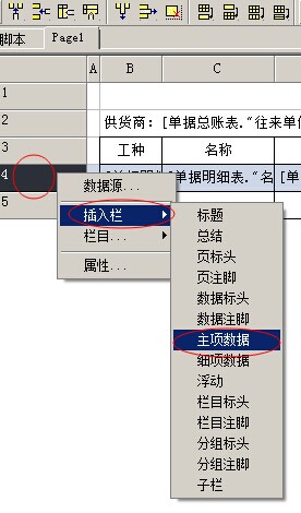 我們首先在左側第4行點擊鼠標右鍵,選擇插入欄(第一次使用,欄目中沒有,要選擇插入。第二次使用,在欄目中選擇),選擇【主項數(shù)據(jù)】。在彈出的窗口中選擇【單據(jù)明細表】。如下面兩張圖: