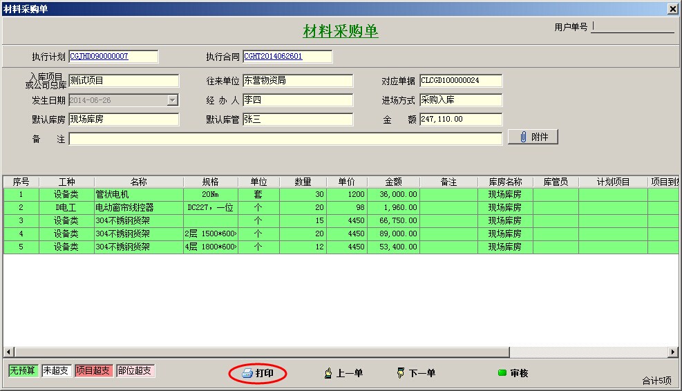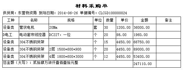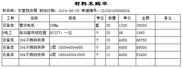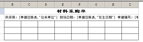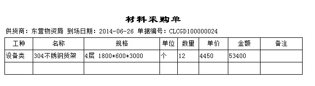 以下圖中單據(jù)(材料采購單)為例,新建一個打印報表。