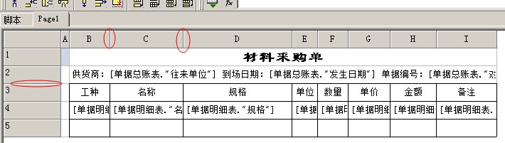 7. 把單據(jù)中需要打印的內容,放入表格中。例如:材料的工種,名稱、規(guī)格、單位、數(shù)量、單價、金額、備注等,如下圖,在第三行中我們輸入名稱,第三行中輸入對應的字段名稱。