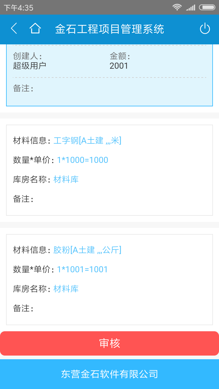 2.金石工程管理軟件手機(jī)端的操作,在配置好企業(yè)微信的前提下,進(jìn)入手機(jī)端的單據(jù)填寫(xiě)并打開(kāi)審核中心,如圖所示