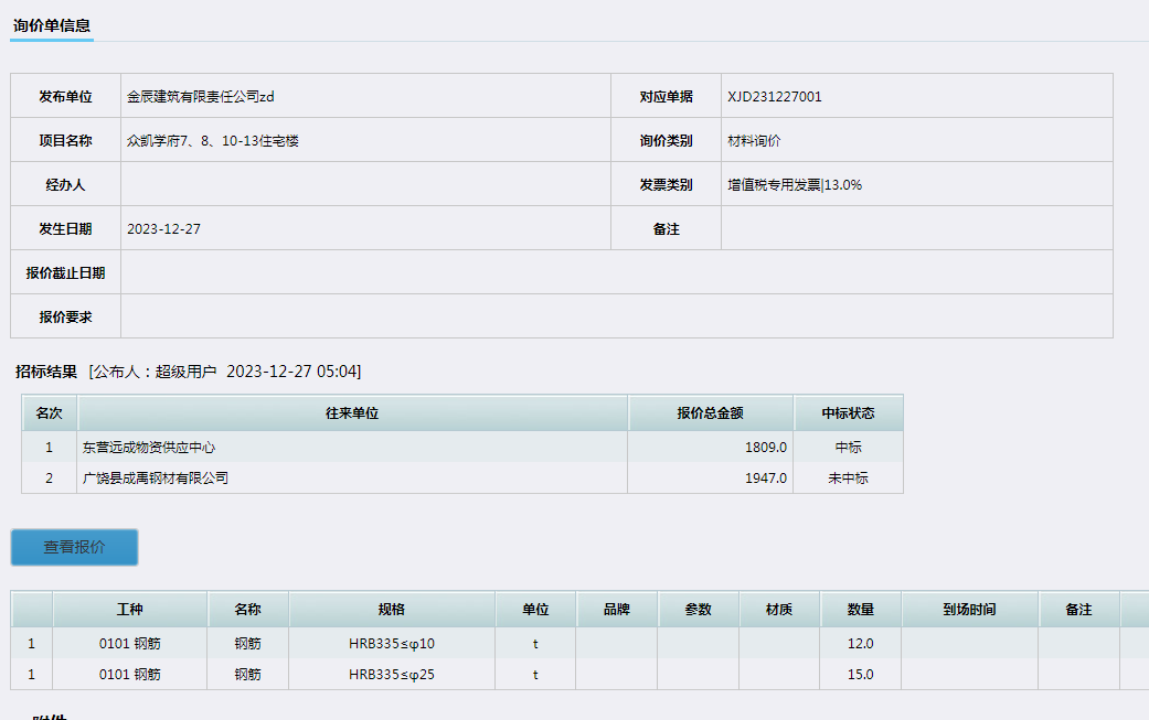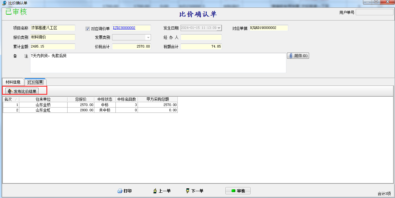 在比價確認單確定好供應(yīng)商后可以直接發(fā)布比價結(jié)果