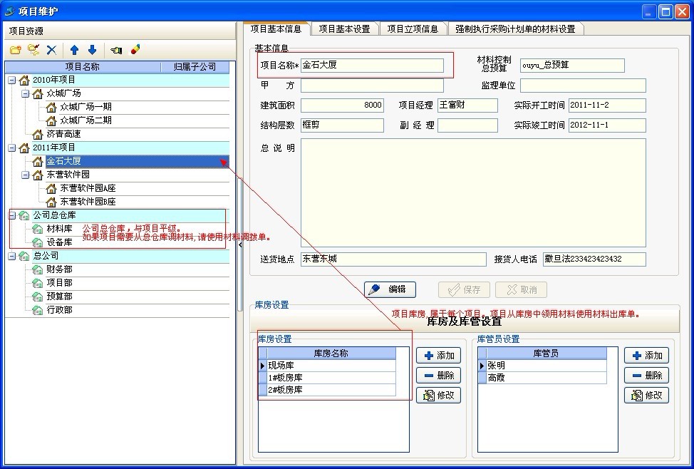 公司倉(cāng)庫(kù)屬于總公司與項(xiàng)目是平級(jí),項(xiàng)目庫(kù)房屬于項(xiàng)目(每個(gè)項(xiàng)目都可以設(shè)置自己的庫(kù)房)。設(shè)置方式如下圖: