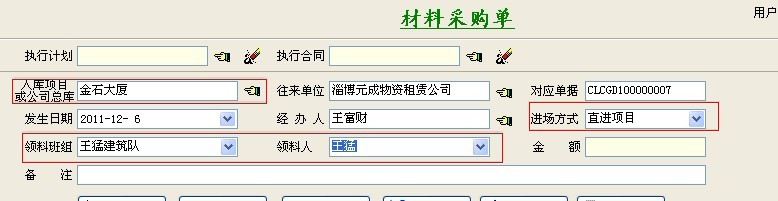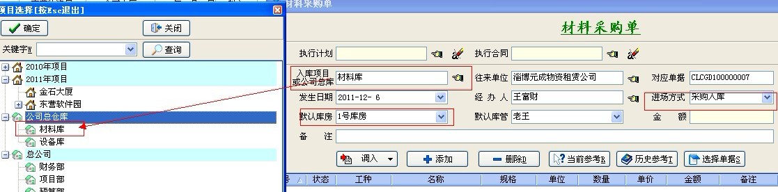 注:材料入場(chǎng)方式一般分為三種:1.材料入項(xiàng)目庫(kù)房、2.材料入公司總庫(kù)、3.材料直進(jìn)項(xiàng)目 如下圖: