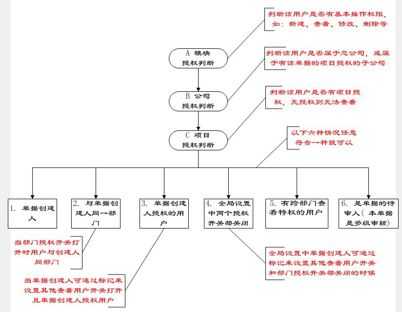 當(dāng)A、B、C三個模塊全部獲得授權(quán)后,再來判斷以下六種,以下情況符合任意一種,用戶就可查看相關(guān)的業(yè)務(wù)單據(jù)。