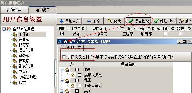C:項目授權(quán)判斷,是指判斷該用戶是否有項目授權(quán),在系統(tǒng)維護(hù)模塊中【用戶管理權(quán)限設(shè)置】和項目維護(hù)中都可以進(jìn)行設(shè)置用戶項目授權(quán)。設(shè)置方法如下圖:
