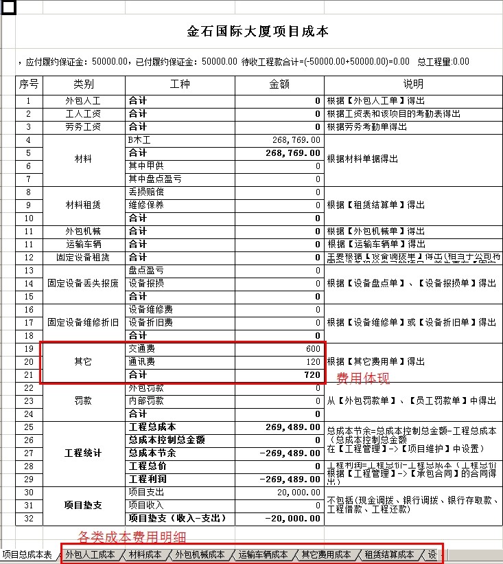 彈出項(xiàng)目成本利潤表,可以查看該項(xiàng)目的其他費(fèi)用項(xiàng)目,是否有顯示之前錄入的費(fèi)用。其他的類別隨著工程的進(jìn)度中,錄入相應(yīng)的單據(jù),會產(chǎn)生其對應(yīng)的成本費(fèi)用。