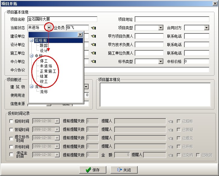 (1)需要再回到【項(xiàng)目開拓】中修改項(xiàng)目開拓的狀態(tài)為中標(biāo)的狀態(tài)(中標(biāo)下的五個狀態(tài)任選一項(xiàng)),然后保存