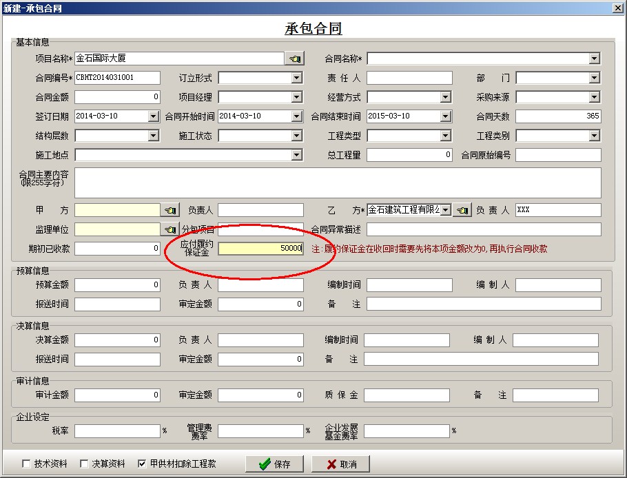 (2)再到【承包合同】中建立對(duì)應(yīng)的合同,并錄入應(yīng)交納的“應(yīng)付履約保證金”。