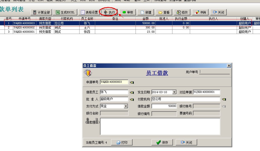 員工請(qǐng)款單可以開啟使用多級(jí)審核,審核之后執(zhí)行付款,生成員工借款單,保存