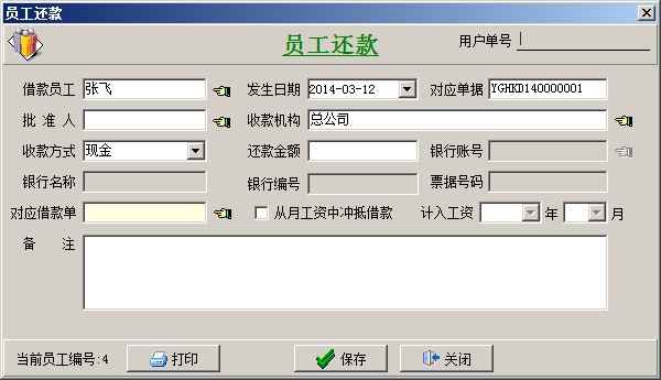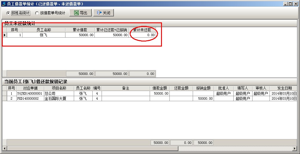 借還款單列表中2個(gè)單據(jù),一個(gè)是業(yè)務(wù)員(張飛)的借款,另一個(gè)報(bào)銷還款單據(jù),兩個(gè)單據(jù)抵消,業(yè)務(wù)員(張飛)就沒有欠款。還可以通過員工借款單統(tǒng)計(jì)查詢,財(cái)務(wù)管理模塊------相關(guān)查詢-----員工借款單統(tǒng)計(jì)。