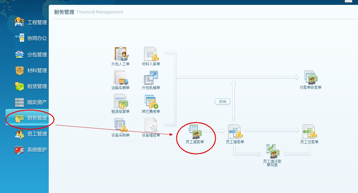 先做員工請(qǐng)款單(借款單的控制單據(jù)),打開財(cái)務(wù)管理模塊,員工請(qǐng)款單